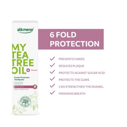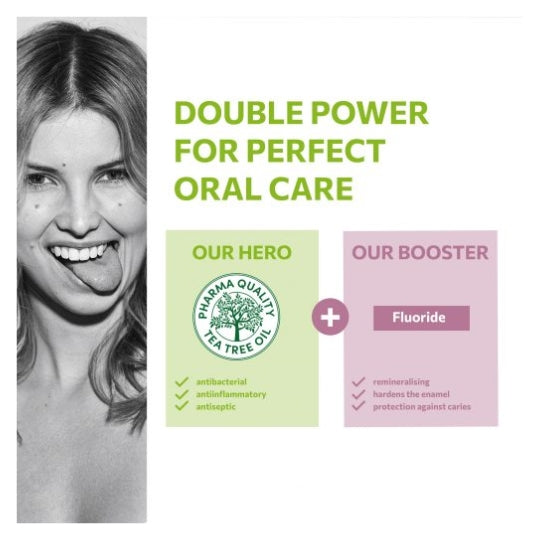 The highly effective formula with tea tree oil and fluoride has a 6-fold effect and can help reduce gum bleeding and prevent inflammation: 1. Prevents caries 2. Reduces plaque 3. Protects against sugar acid 4. Protects the gums 5. Strengthens the enamel 6. Freshens breath For strong teeth, healthy gums and a fresh, clean feel in your mouth. Tested by dental professionals.