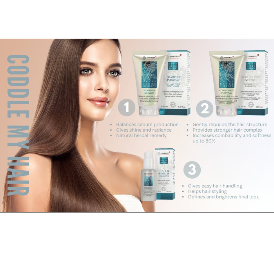 Natural ingredients combined with DERMATOPOIETIN®-PLUS help hair to get a great look. Used in combination with SHAMPOO AND CONDITIONER - SWISS HERBS THERAPY EVERYDAY», it gives gorgeous style and volume to hair.