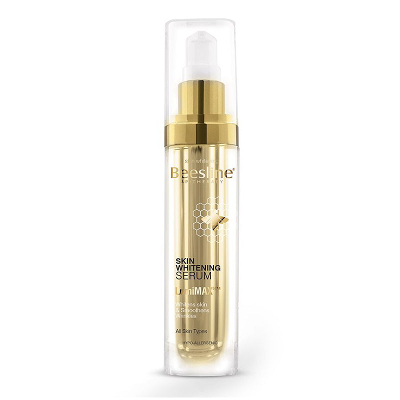 Beesline Skin lightweight corrective whitening serum with SPF 30 protection, formulated to hydrate & smooth fine lines while boosting radiance & evening skin tone to reveal a flawless complexion. For all skin types.