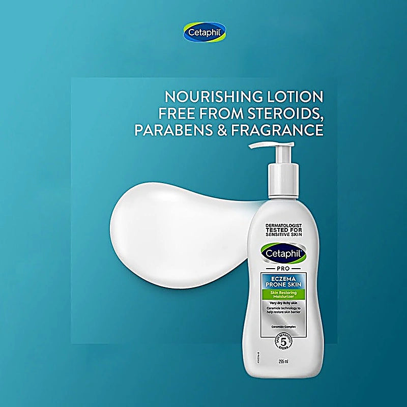 Cetaphil Pro Eczema Lotion Body Moisturiser is a creamy, non-greasy moisturizer clinically proven to moisturize and soothe dry, itchy skin.