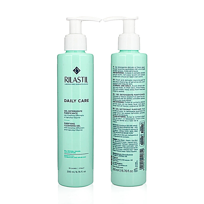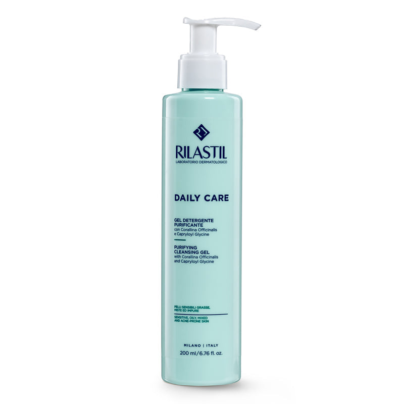Rilastil Daily Care Purifying Cleansing Gel is a soap-free facial cleanser that gently removes excess oil and impurities without over-drying the skin.Â