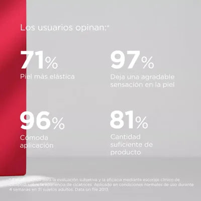 Rosehip oil and vitamin E acetate help to repair scar tissue. Its formulation with centella asiatica triterpenes and glycerin helps to improve elasticity. Dexpanthenol helps to mitigate pigmentation and itchiness and strengthens the barrier action.