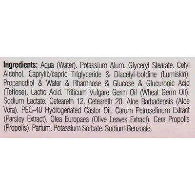 Aqua. Potassium Alum. Glyceryl Monostearate. Cetyl Alcohol. Caprylic/Capric Triglyceride & Diacetyl-Boldine. Propanediol & Water & Rhamnose & Glucose & Glucuronic Acid. Lactic Acid. Triticum Vulgare Germ Oil. Sodium Lactate. Ceteareth 12. Ceteareth 20. Aloe Barbadensis. Peg-40 Hydrogenated Castor Oil. Carum Petroselinum Extract. Olea Europaea Extract. Cera Propolis. Parfum. Potassium Sorbate. Sodium Benzoate.
