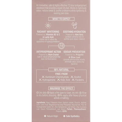 An innovative, safe & highly effective 72hr antiperspirant deodorant that provide a super dry feel & ultimate freshness. Works to fight body odour, reduce sweat & soothe underarm while lightening and evening skin tone.