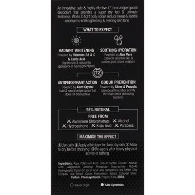 An innovative, safe & highly effective 72hr antiperspirant deodorant that provide a super dry feel & ultimate freshness. Works to fight body odour, reduce sweat & soothe underarm while lightening and evening skin tone.