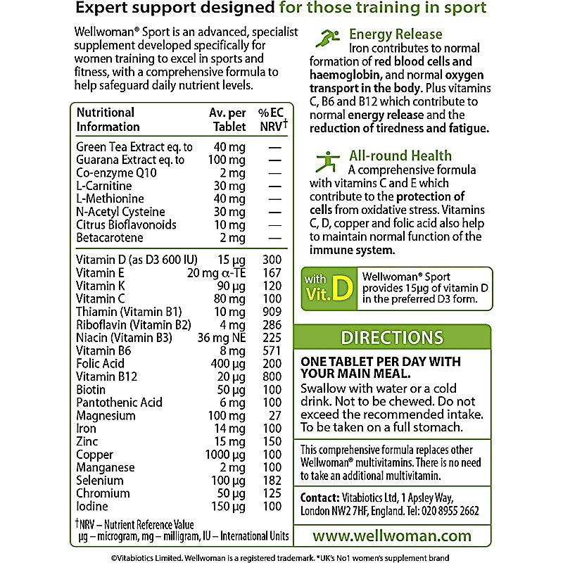 Vitabiotics Wellwoman Sport Tablets is an advanced specialist supplement developed specifically for women training to excel in sports and fitness, with a comprehensive formula to help safeguard daily nutrient levels.It contains iron which contributes to normal formation of red blood cells and haemoglobin, plus normal oxygen transport in the body. In addition vitamins C, B6 and B12 contribute to normal energy release and the reduction of tiredness and fatigue.